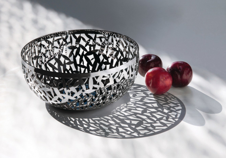 Rund fruktkorg i 18/10 rostfritt stål, spegel polerad, med kant dekorerad med laserskärning. Spegel polerad. “CACTUS!” dekoration har funnits sedan 2000 i flera olika brickor, korgar och föremål för köket.
