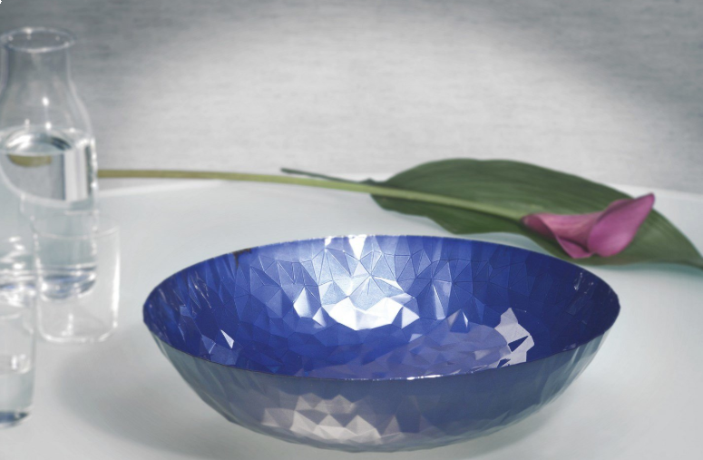 Den runda korgen “Joy” har designats av Claudia Raimondo. Formen och dekorationen av stålplåten skapas genom en sofistikerad och modern gjutningsteknik. Objektets ansikten skapar sin form: stora och öppna med odefinierade kanter och med ett fascinerande spel av reflektioner som påminner om föremål handgjorda i ädla metaller. Strukturen framkallar bakgrunden i den digitala världen och tolkar stål igen genom att spela på designens svårfångande, vilket får objektet att se ut som något smidigt och naturligt även om det kristalliseras till en fast sak.