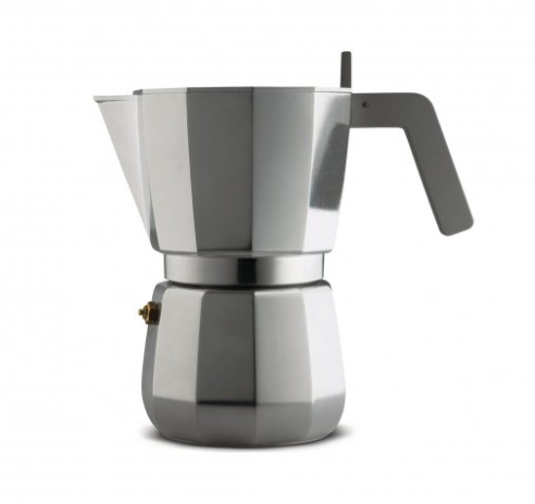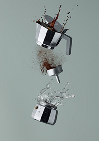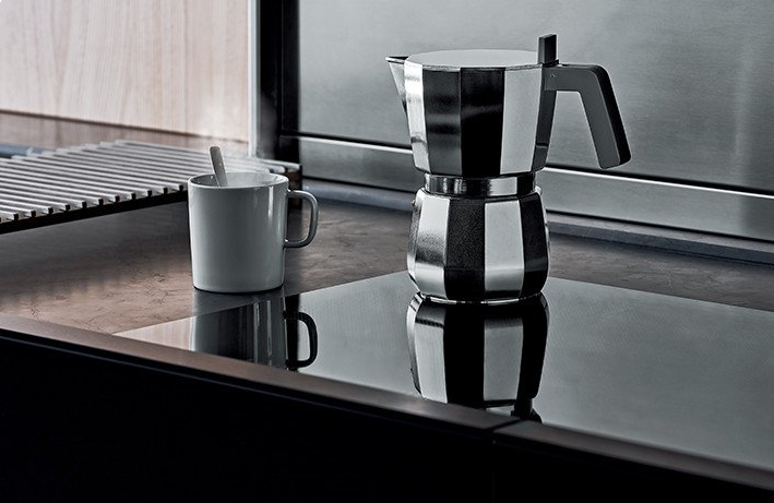 En elvsidig volym för en kaffebryggare med en bekant och samtidigt innovativ form: Chipperfield introducerar en serie detaljer som gör Moka-designen ny och ännu mer funktionell, till exempel det plana locket på vilket kopparna ska placeras uppvärmd – vilket möjliggör optimal njutning av dryckens arom och smak – eller rattens läge som gör att du enkelt kan lyfta locket med bara en hand.