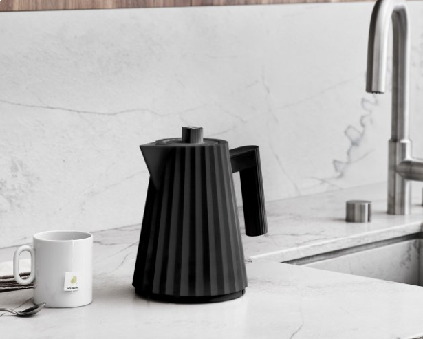 Plissé – den här produktens själva namn förklarar dess skulpturella natur: som ett tyg som en tjock veckning förvandlas till en tredimensionell form, påminner denna vattenkokare om en haute couture-klänning.
