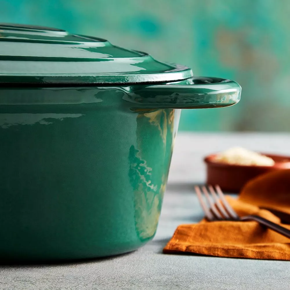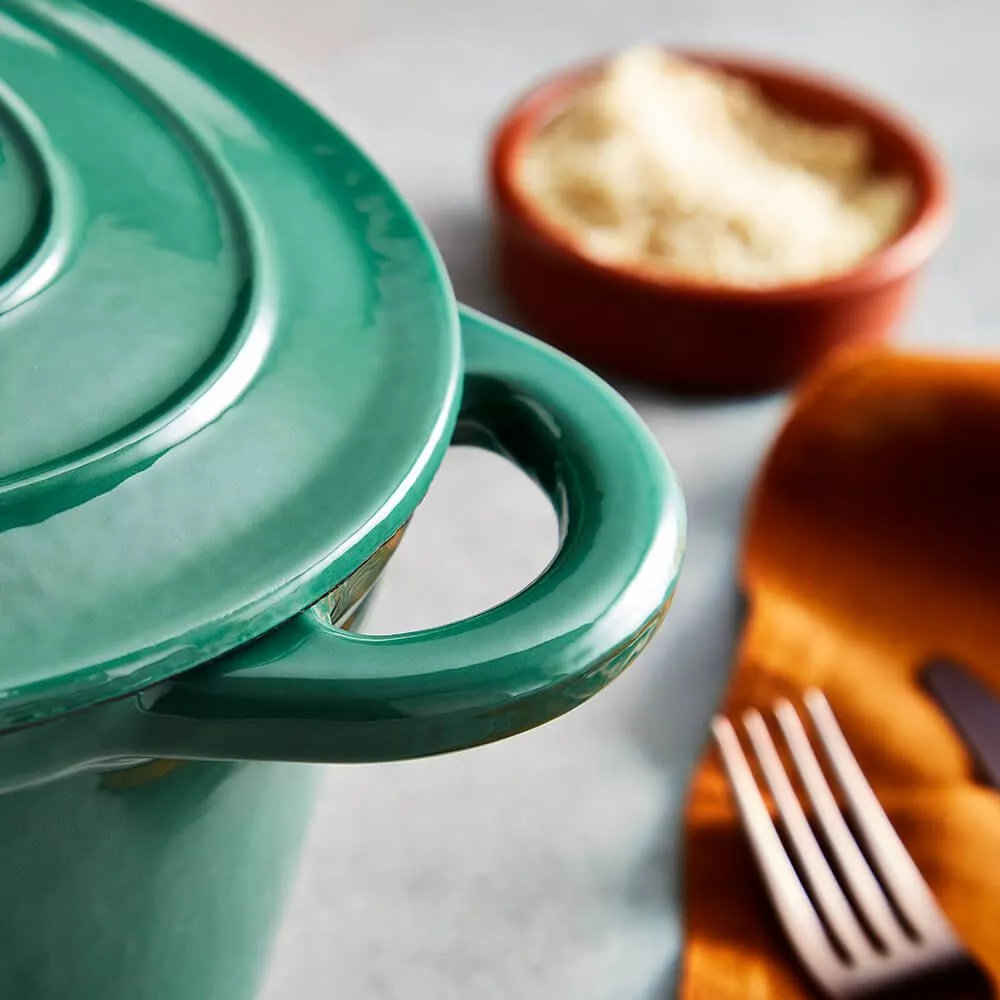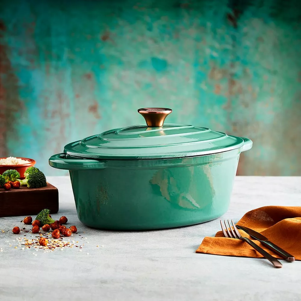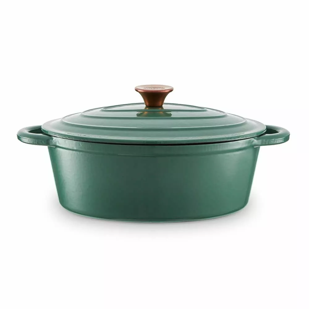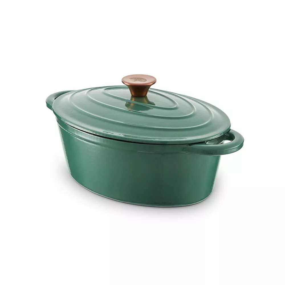 Denne Barbary & Oak 29cm Ovale Casserole Dish er en pålitelig kokkekamerat som enhver ivrig kokk trenger på kjøkkenet sitt. Designet i fire fargevarianter; Limoges Blue, Bordeaux Red, Camembert Cream og Verdigris Green, har retter et høyt kvalitets støpejerns konstruksjon som er holdbart og bygget for å vare. Støpejern bevarer varme, noe som betyr at det holder maten varmere lenger og er perfekt for de som elsker å lage deilige gryteretter for hele familien. Den emaljerte interiøret forhindrer maten fra å feste seg, er lett å rengjøre og vil ikke absorbere lukt eller smak. Allsidig i designet, er gryten egnet for alle komfyrtyper inkludert induksjon, og er også grill- og ovnssikker opp til 260°C. En skålformet lokk følger med, som hjelper til å låse inn og bevare all fuktighet for å sikre at maten blir øm med forbedret smak. Håndtakene på hver side gir en enklere håndtering for å bære maten fra ovnen til bordet.