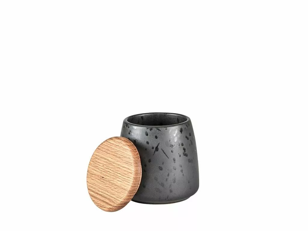 Vacker och funktionell burk i matt krämfärgat stengods med eklock för förvaring av korn, ris, salt, te och liknande. Locket är försett med en silikonring och stängs helt tätt. Burken kan tvättas i diskmaskinen medan trälocket tvättas för hand. 12 cm hög.