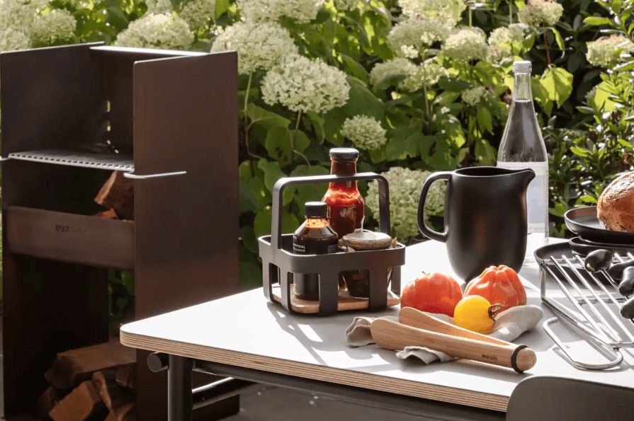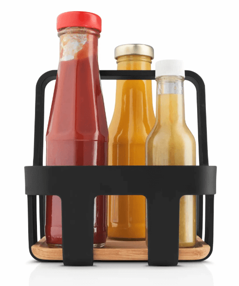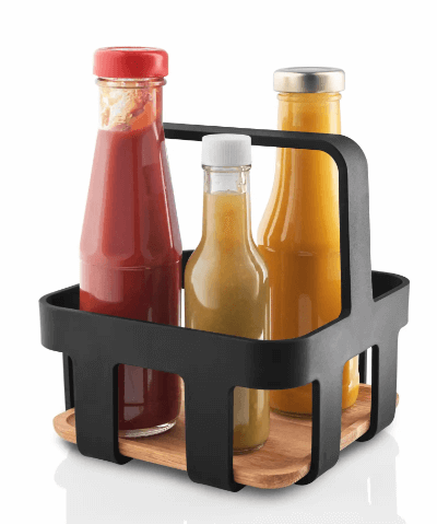 Dette stativet er et dekorativt og tidløst design som lar deg samle olje og eddik på en praktisk måte. Stativet har et bærehåndtak som gjør det enkelt å ta med ut til grillkvelder eller plassere på spisebordet. Det gir deg enkel tilgang til oljer, dressinger og krydder når du trenger dem, og er enkelt å ta med inn igjen når måltidet er ferdig.