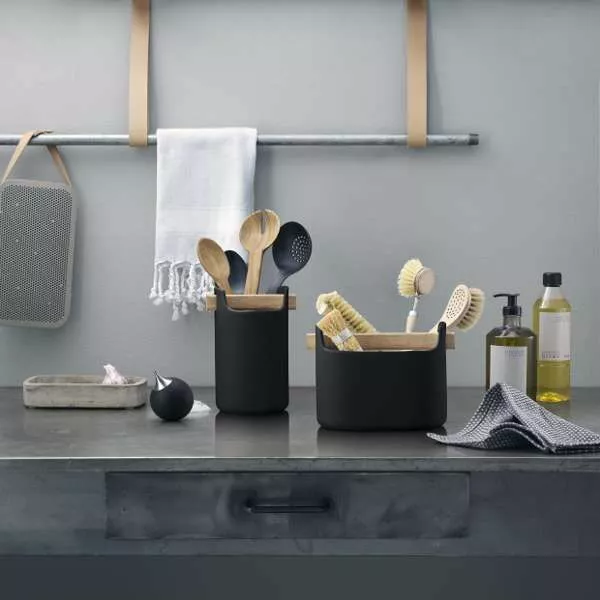VERKTYGLåda Med en verktygslådeförvaringsburk blir det lätt att bli av med röran och säkerställa ett snyggt kök eller skrivbord. Förvaringsburken har ett trähandtag som delar rummet i två, så att det är möjligt att hålla olika typer av redskap separata. Förvaringsburken är väl lämpad för förvaring av t.ex. köksredskap, diskborste, köksduk och kruksvamp eller pennor, sax och linjal.