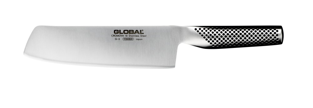 Det höga bladet på G-5 Vegetable Knife, Oriental, ger utrymme för att stödja knogarna för bra kontroll över kniven. Bladets avrundning innebär att kniven kan flyttas i en gungande, kontrollerad rörelse utan att du behöver lyfta kniven från skärbrädan. Globals fokus på ergonomi och optimal användbarhet gör serien populär bland både professionella och amatörkockar. Den globala serien har över 70 delar för alla ändamål. Hela sortimentet finns här.