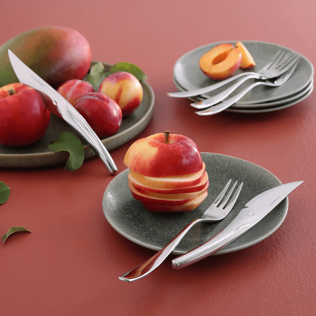 Knivene passer ypperlig til skrelling og deling av frukt og grønnsaker. Knivbladet er i rustfritt stål for å tåle fruktsyre. Hakket i kniven gjør at du lettere kan dele frukt og grønnsaker presist. Polert finish. Leveres i gaveeske.