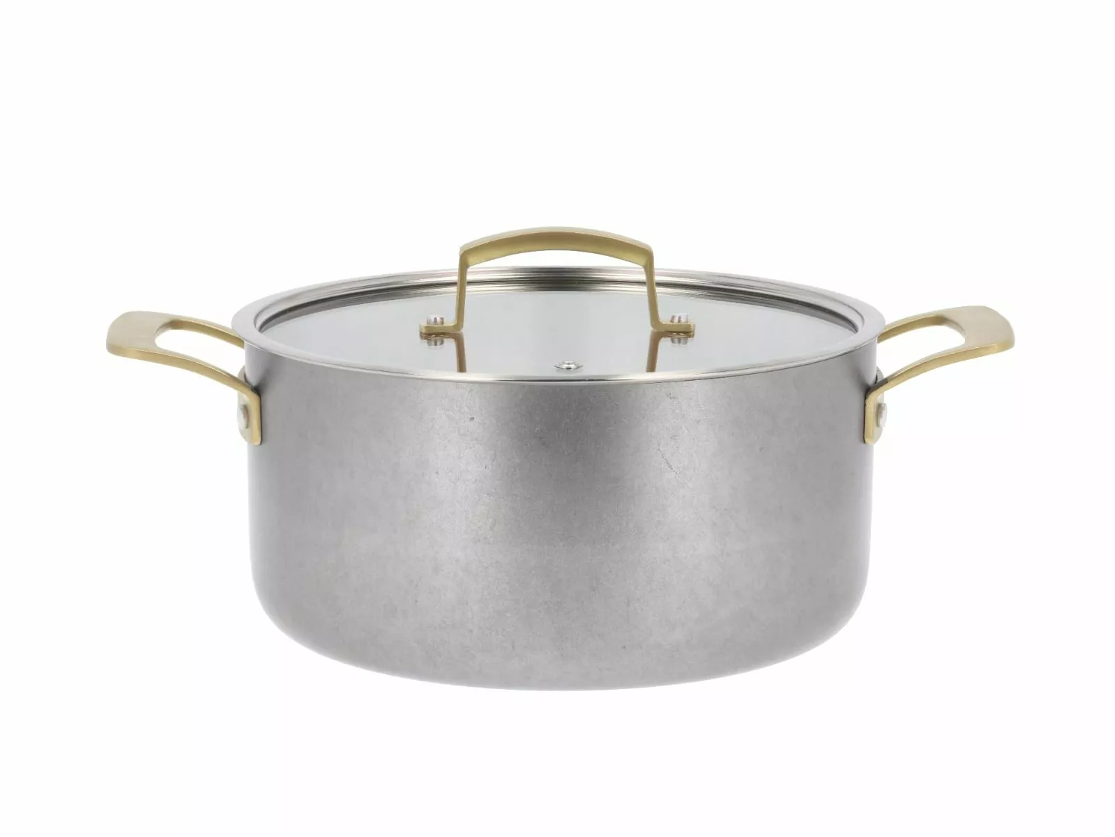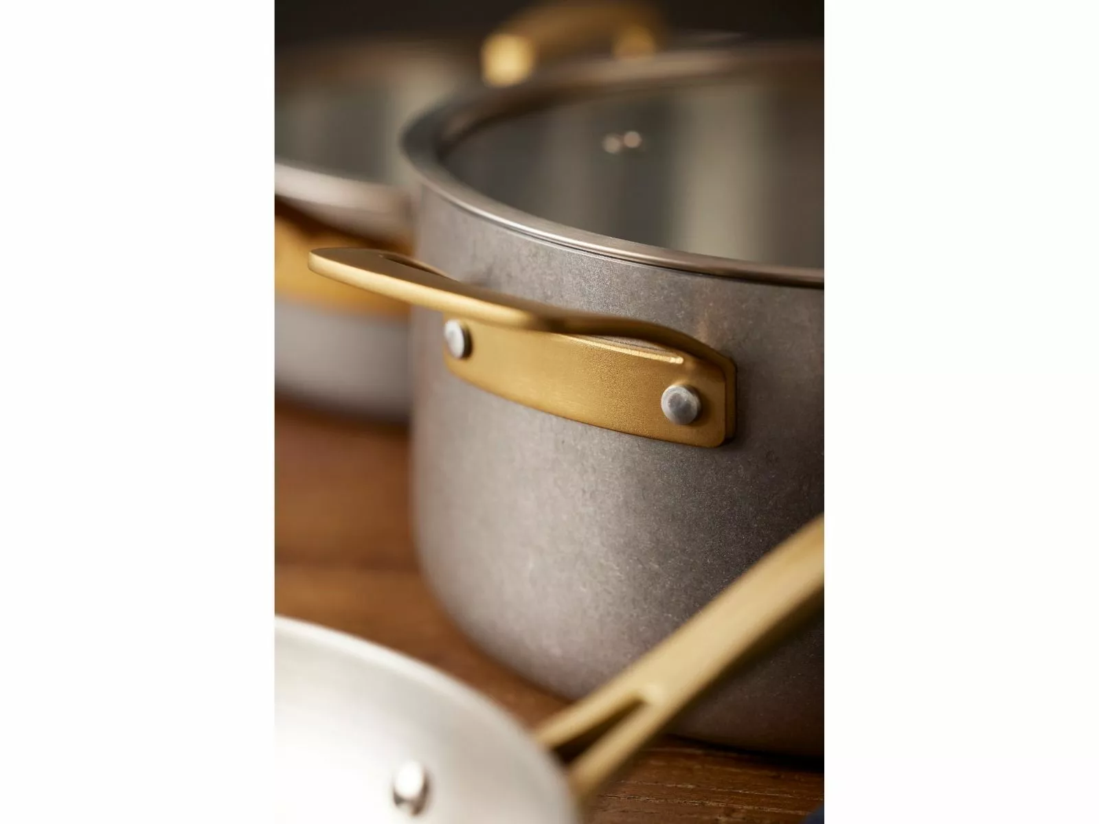 Laget av 18/10 rustfritt stål med en solid 2,5 mm trelagskonstruksjon av rustfritt stål, aluminium og rustfritt stål. Mellomlaget av aluminium sikrer optimal varmefordeling. Støpte, PVD-forgylte stålhåndtak som er festet med nagler. Utsiden har vintage-polering. Glasslokk med damphull. Målestreker innvendig i kasseroller og gryter. Passer til alle varmekilder, inkludert induksjon. Tåler oppvaskmaskin.