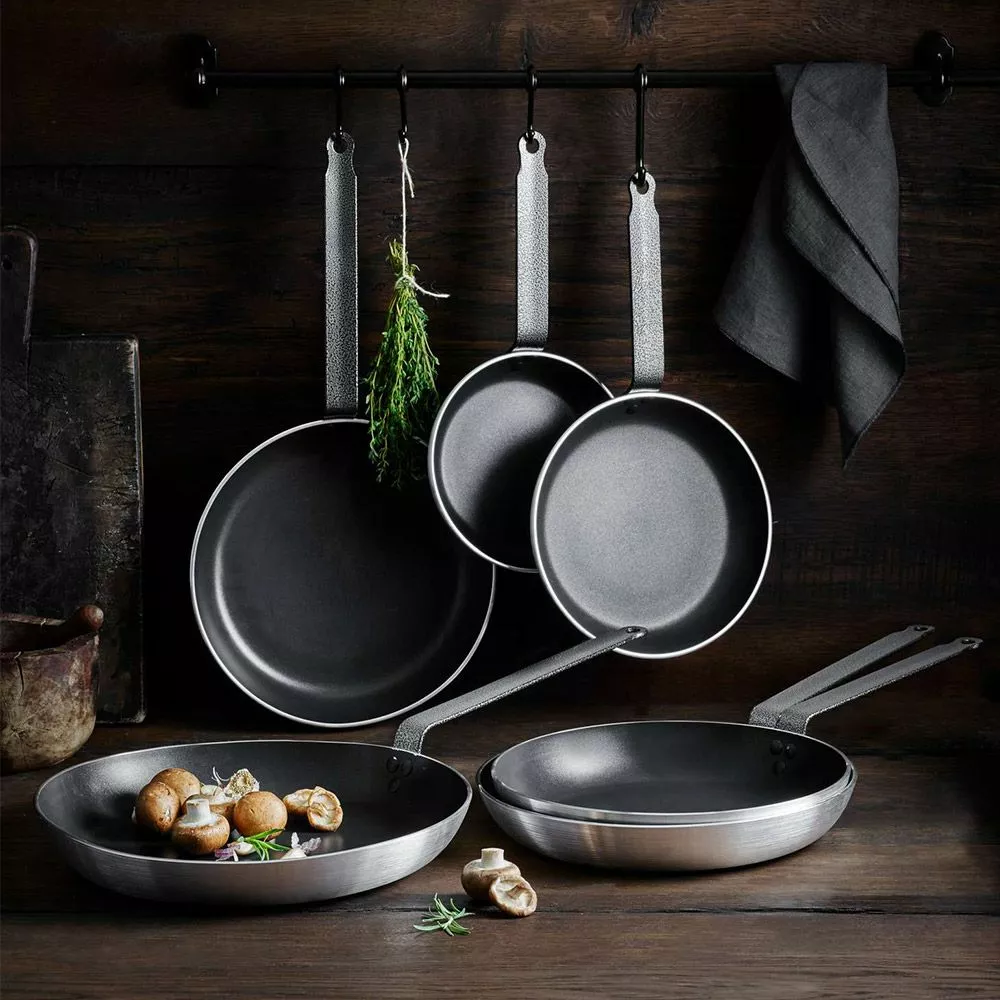 • De buede Carbon stålhåndtakene sikrer et godt grep på pannene