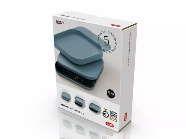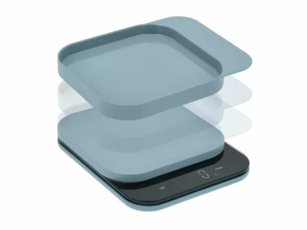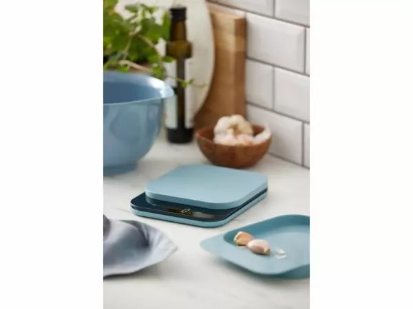 Mensura kjøkkenvekten i Dusty Blue har et LED-display som viser vekt i intervaller på 1 g/0,1 oz og kan veie opptil 10 kg/22 lb. Bollen er laget av ABS og kan romme opptil 300 ml, og fungerer som lokk når vekten ikke er i bruk. Den bruker 3 x AAA-batterier. (som ikke er inkludert)