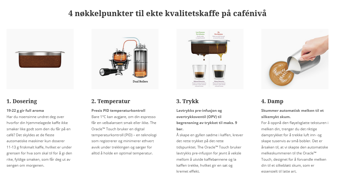 Till skillnad från andra automatiska espressomaskiner kompromissar inte Oracle ™ Touch de fyra nyckelpunkterna, som ger kaffe av riktig kvalitet på kafénivå. Här är en mer intelligent, automatiserad espressomaskin som ger smak, enkelhet och kvalitet.