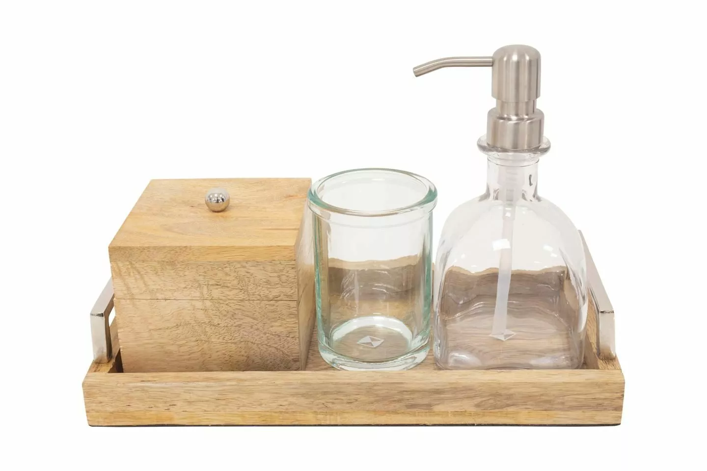 Produktinformation • Trälåda med metallknopp • Storlek 10x10x9 cm • Badrumsserie bestående av tvålautomat, tandborsthållare, låda och bricka