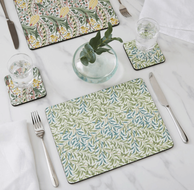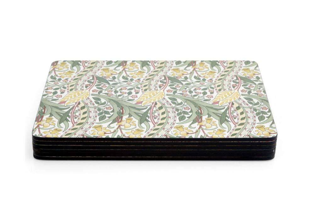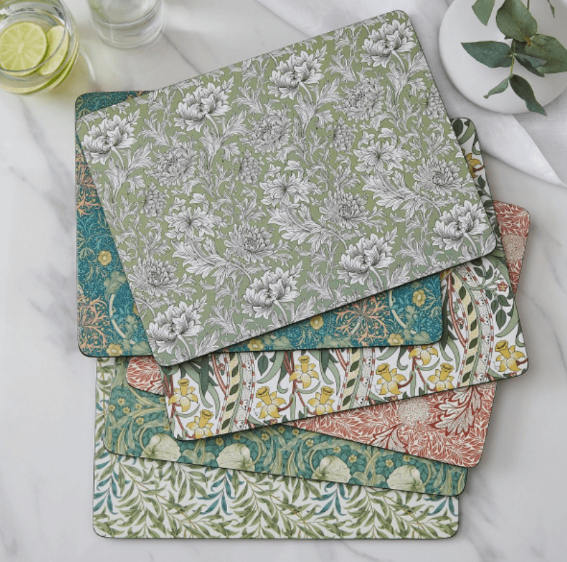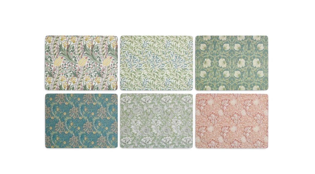 Løft hverdagen og gjør middag til en drøm med disse umiskjennelige dekkebrikkene fra Spode Morris & Co. Hver dekkematte i det stilige settet på seks er kunstferdig dekorert med et annet William Morris-arvdesign for en trendy miks og match-utseende som garantert vil snakke om bordet, spesielt når du skal underholde gjester. Utvalgte design inkluderer de evige elegante Pimpernel-, Willow Bough-, Seaweed- og Apple-mønstrene. Koble dem sammen med det identiske settet med seks dalbaner og lek med klassiske mønstre på tvers av bordet ditt. Korkstøttet og forseglet for varme- og flekkmotstand, vil disse dekkemattene være den perfekte gaven til et nytt hjem.