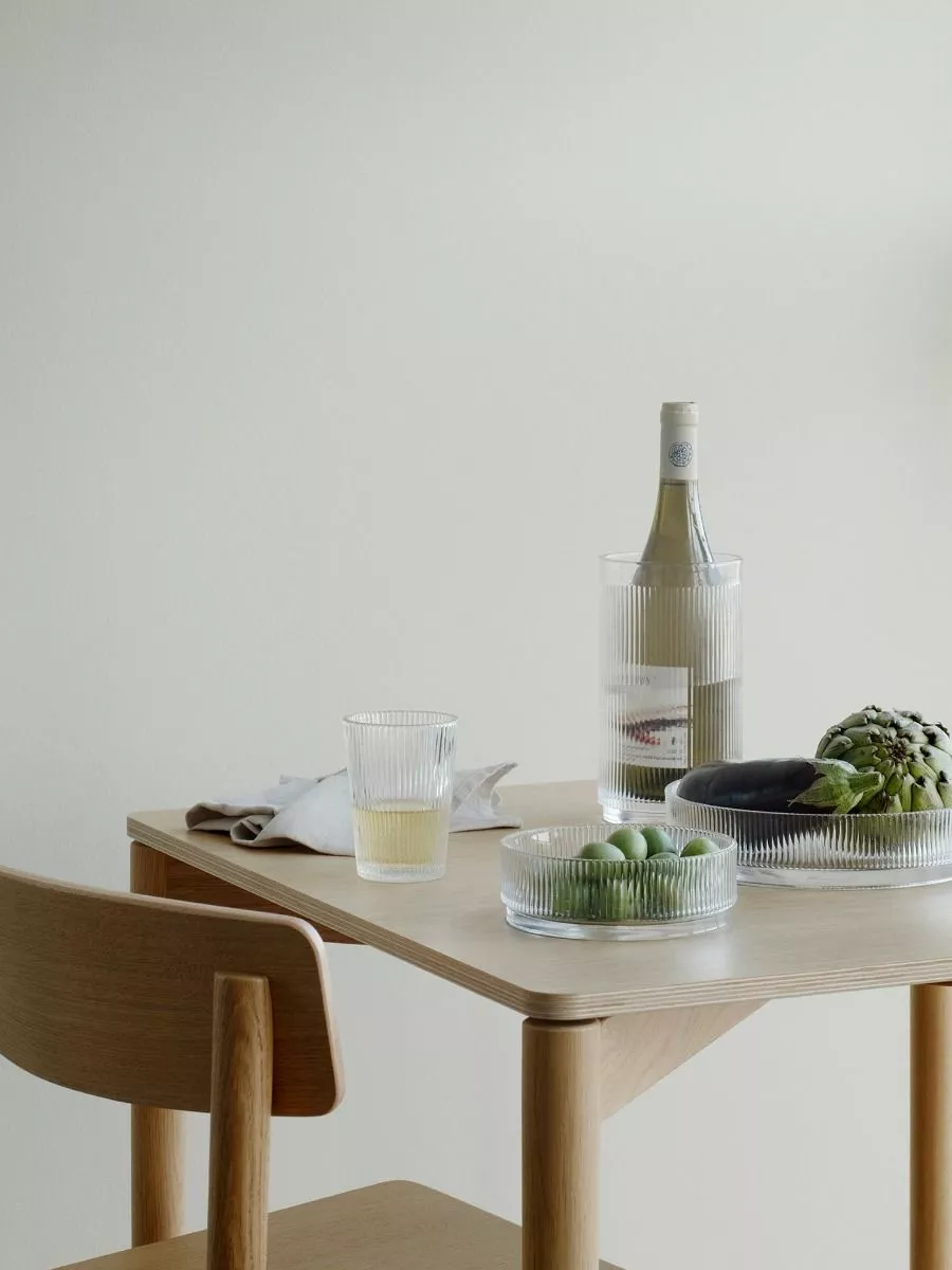 Et kjølig glass vin på en varm dag. En salat servert i en vakker glassbolle. Dette er de små tingene som kan gjøre hverdagen til en fest. Designer Francis Cayouette har designet en vinkjøler og serveringsskåler i to størrelser som passer til Steltons Pilastro-drikkeglass. Han har blitt inspirert av den elegante og funksjonelle Art Deco-stilen på 1920-tallet, som dominerte arkitektur og design. Det har blitt et sofistikert uttrykk som gjentas i både vinkjølere og serveringsskåler