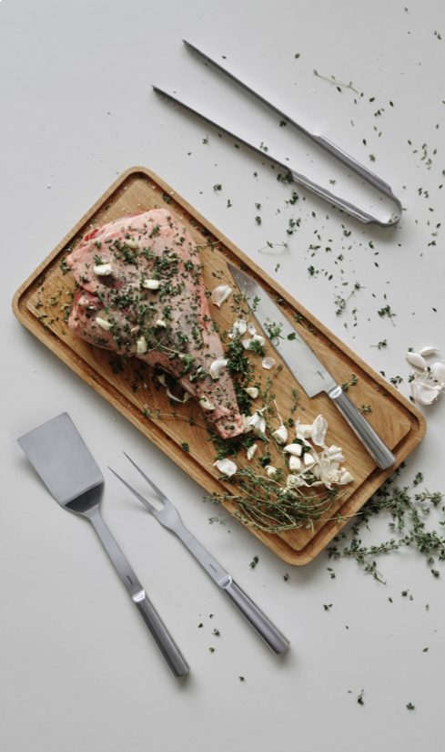 Den danska designern Søren Refsgaard står bakom denna eleganta skärbräda med praktiskt juice. Skärbrädan är gjord av fast europeisk, vit ek, som har ett högt innehåll av garvsyra, vilket gör brädet naturligt antibakteriellt. Brädet tvättas och oljes med livsmedelsgodkänd olja, så det förblir snyggt längre. Ek är ett extremt hållbart naturmaterial som skyddar dina knivar och förlänger deras livslängd.