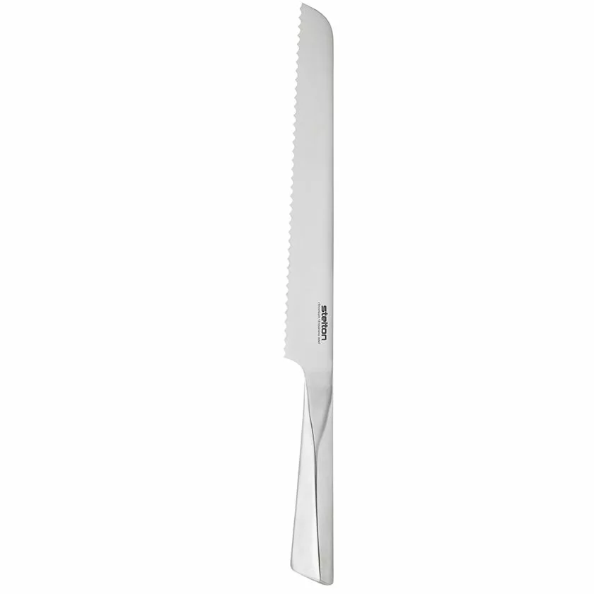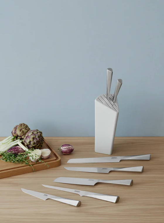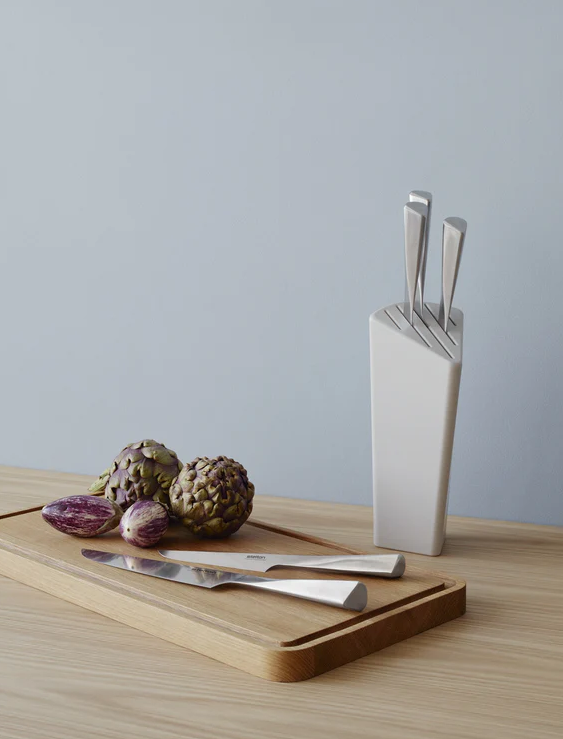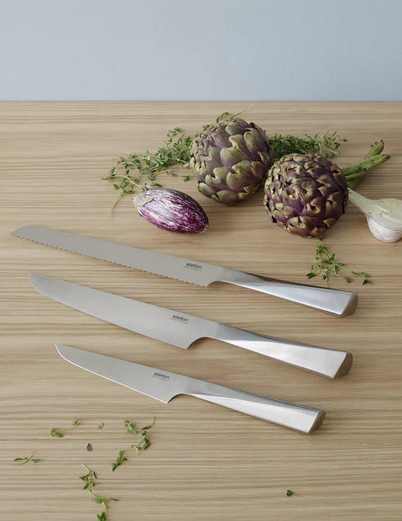 Trigono-brødkniven er laget av japansk Chromium 18-stål, et svært slitesterkt, rustfritt stål som gir Trigono-knivene enestående, langvarig skarphet og høy grad av anløpsmotstand når de brukes på sure matvarer. Chromium 18 stål tilbyr den perfekte balansen mellom slitesterk hardhet og en mykhet som er perfekt for sliping, noe som resulterer i skarpe kniver som er enkle å vedlikeholde. Sammen gir den utmerkede balansen og det trekantede håndtaket et trygt, komfortabelt grep for alle håndstørrelser. Trigono er en serie med fem forskjellige kniver, hver med sitt eget formål. De er tegnet av den danske arkitekten Simon Kalmer.