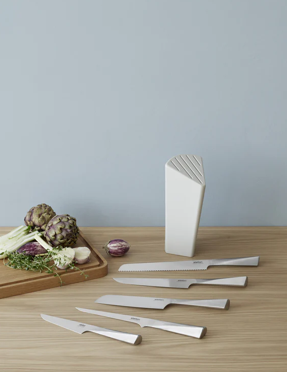 Trigono-utbeningskniven er laget av japansk Chromium 18-stål, et svært slitesterkt, rustfritt stål som gir Trigono-knivene enestående, langvarig skarphet og høy grad av anløpsmotstand når de brukes på sure matvarer. Chromium 18 stål tilbyr den perfekte balansen mellom slitesterk hardhet og en mykhet som er perfekt for sliping, noe som resulterer i skarpe kniver som er enkle å vedlikeholde. Sammen gir den utmerkede balansen og det trekantede håndtaket et trygt, komfortabelt grep for alle håndstørrelser. Trigono er en serie med fem forskjellige kniver, hver med sitt eget formål. De er tegnet av den danske arkitekten Simon Kalmer.