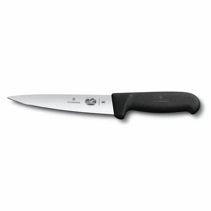 En 16 cm utbeiningskniv fra Victorinox, laget av rustfritt stål og med et sort plastskaft. Knivbladet er stivt og har en spiss tupp som gjør den ideell for utbeining, slakting og partering.