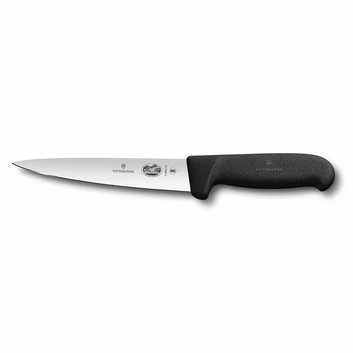 En utbeiningskniv fra Victorinox med en bladlengde på 18 cm, laget av rustfritt stål og med et sort plastskaft. Knivbladet er stivt og har en spiss tupp, noe som gjør den velegnet til utbeining, slakting og partering.