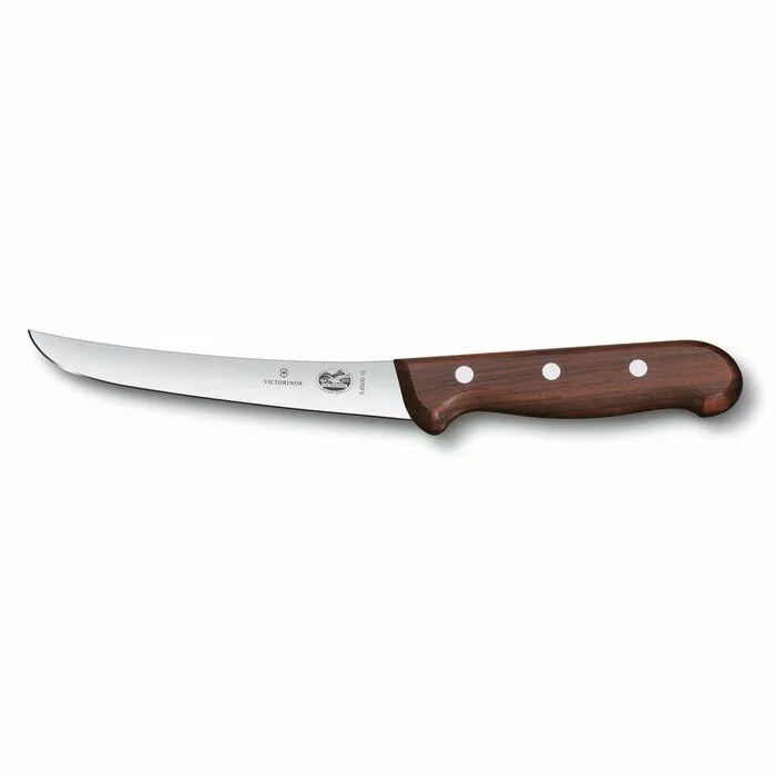 En utbeiningskniv fra Victorinox har et buet og smalt blad på 15 cm, laget av rustfritt stål med et treskaft. Dette bladet gjør det enkelt å komme tett på benet og skjære løs kjøttet under utbeningsprosessen.