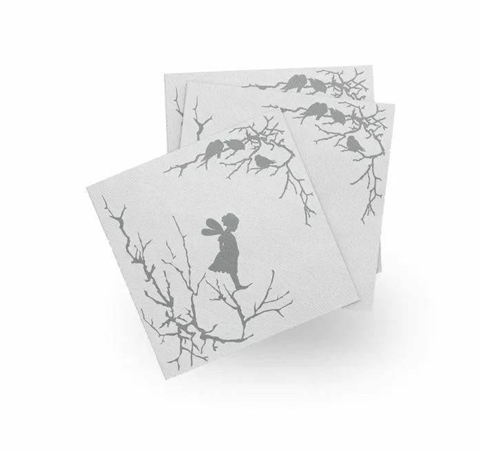 Alfgrå servett med illustrationer, 33 × 33 cm. Förpackningen innehåller 12 servetter.